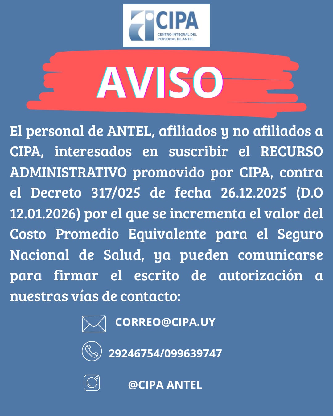 El Centro Integral del Personal de ANTEL (CIPA) informa a sus afiliados que, con la entrada en vigencia del Decreto del Poder Ejecutivo Nº 317/025,