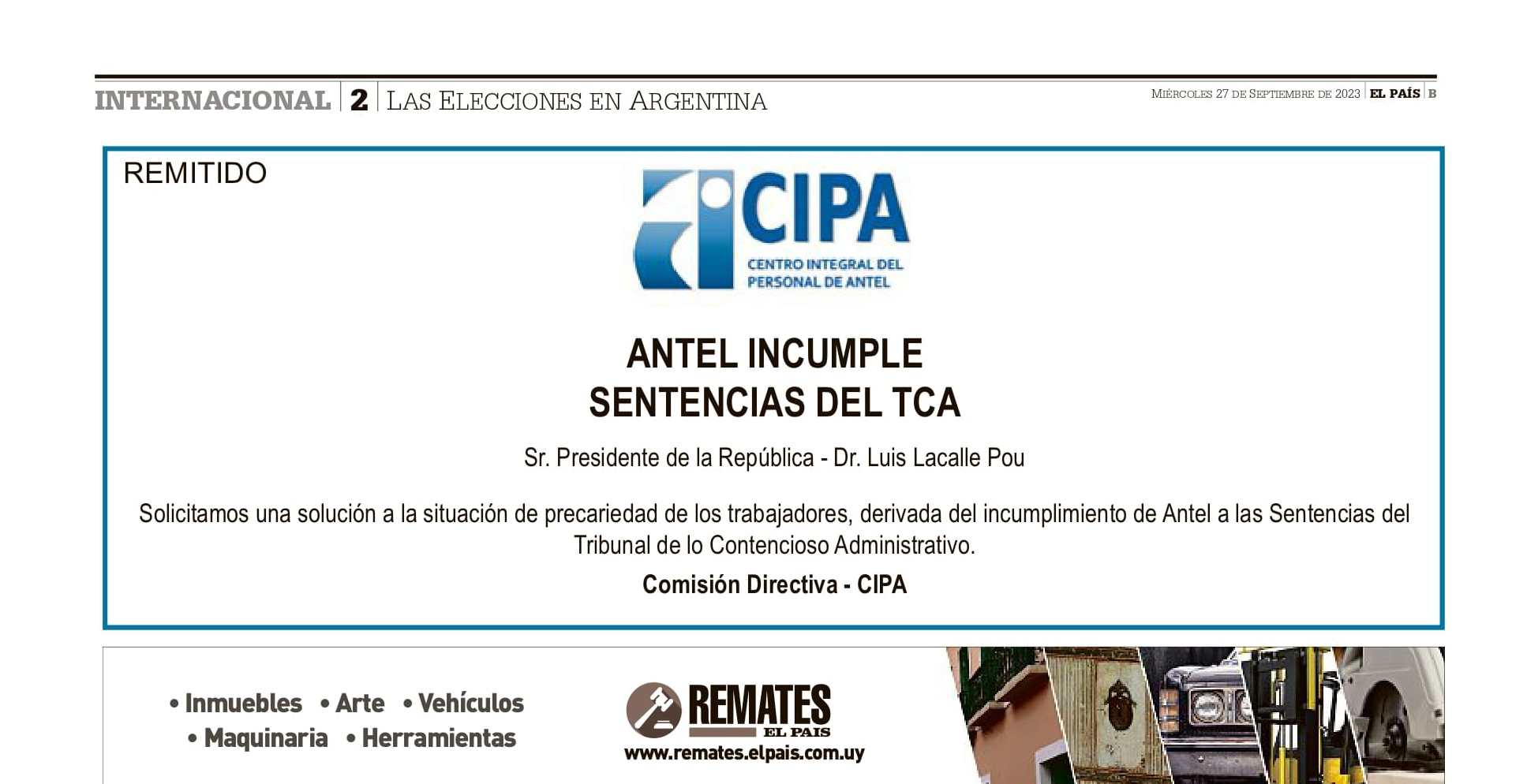 CENTRO INTEGRAL DEL PERSONAL DE ANTEL (CIPA) ASAMBLEA GENERAL EXTRAORDINARIA LEVANTAMIENTO DE CUARTO INTERMEDIO Estimado Socio: De acuerdo a lo resuelto por la Asamblea, se comunica el levantamiento